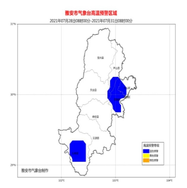★ 雅安市气象台发布高温蓝色预警,预计从今天开始,未来3-5天,名山区、石棉县、芦山县、雨城区的大部分地方将连续出现日最高气温达到35℃以上的高温天气,个别地方可达37℃以上。