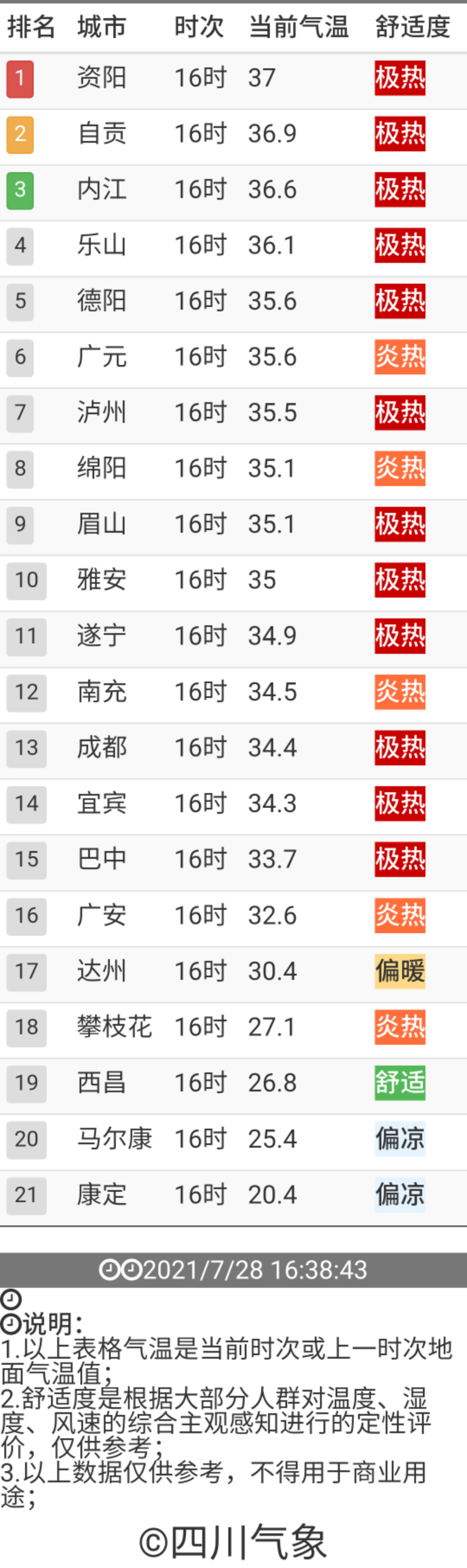 目前,四川境内尚没有气象站点登上全国高温排行榜。