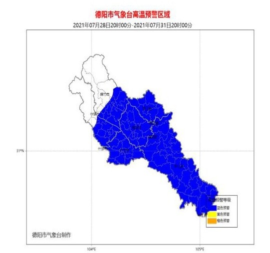★ 德阳市气象发布高温蓝色预警:预计29日至8月2日,未来3-5天,旌阳、罗江、广汉、中江及绵竹、什邡的坝区将持续出现日最高气温达到35℃以上的高温天气。