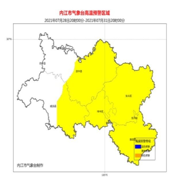 当天,继成都市、绵阳市气象台7月27日发布高温蓝色预警之后,雅安市、德阳市、内江市也先后发布了高温预警。其中,内江市气象台发出的是高温黄色预警。
