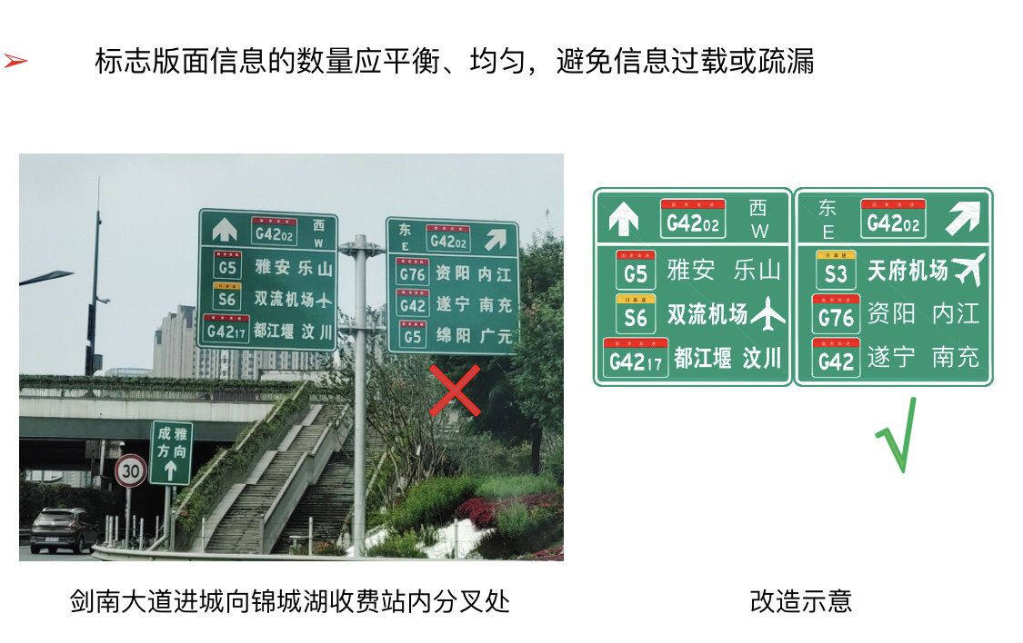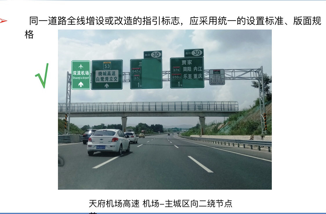日前,省交通执法总队会同公路设计院、天府机场公司和成宜公司与机场集团就机场航站楼编号、机场区域内部客货交通组织和机场指路标志文字简称等达成共识,对通往成都双机场沿线包括一绕、二绕、三绕、天府机场高速、天府机场南线高速、成自泸高速、双流机场高速共7条高速公路,犀浦、永宁、文家场等42个枢纽节点等指路标志情况进行了梳理。