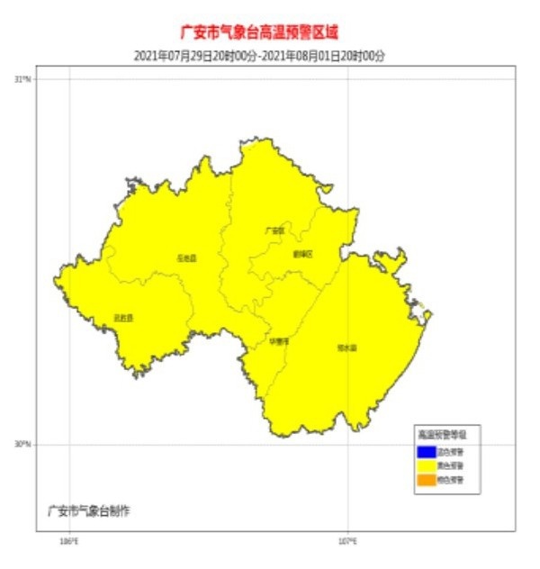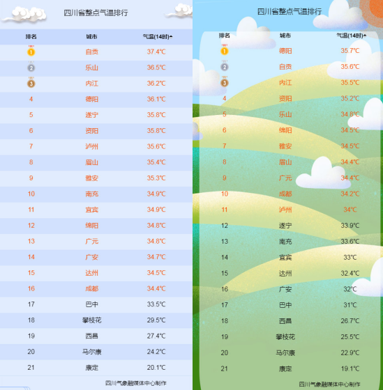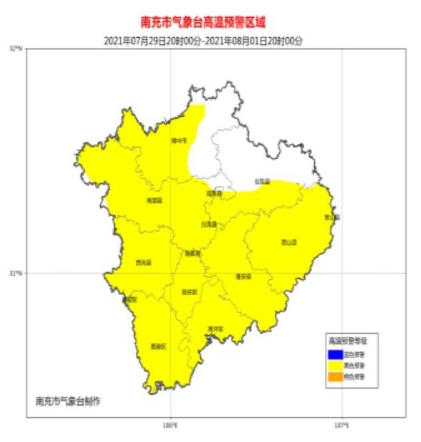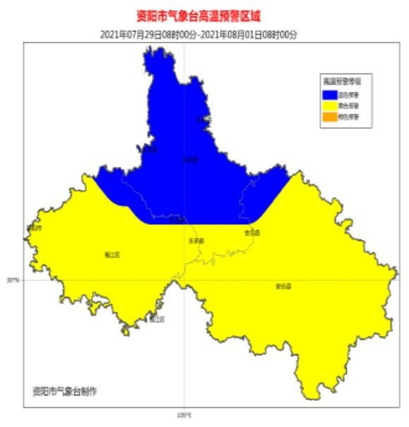 7月29日,四川省内又有5座城市发布高温黄色预警、1座城市发布高温蓝色预警: