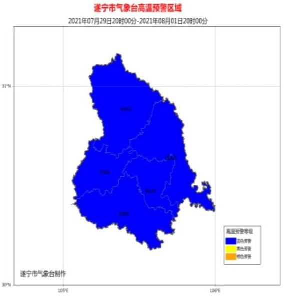▲ 遂宁市气象台预计,7月30日到8月3日,遂宁市大部地区将持续出现36℃及以上的高温天气,蓬溪、大英、船山、安居最高气温可达38℃及以上。