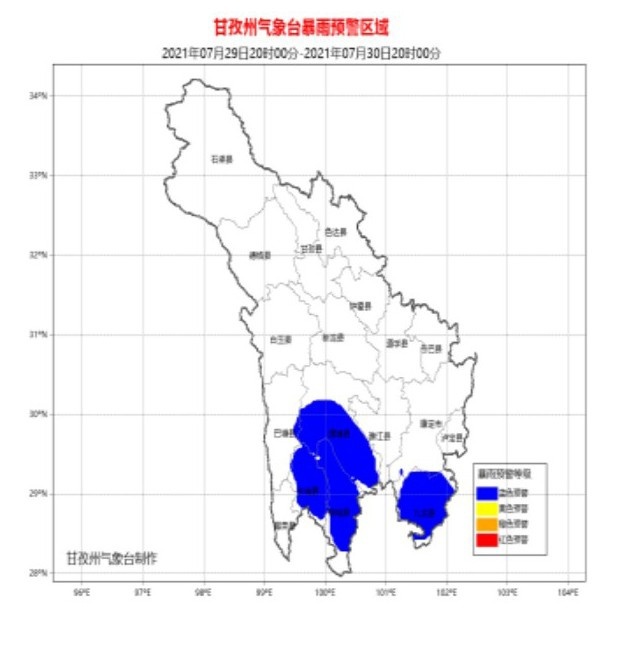 ★★ 甘孜州气象台7月29日16时发布暴雨蓝色预警:预计7月29日20时到30日20时,九龙、理塘、乡城、稻城境内有暴雨。