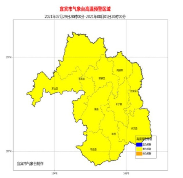▲ 宜宾市气象台预计,7月30日到8月2日,叙州区、高县、屏山县、南溪区、江安县、长宁县、珙县、筠连县、兴文县、翠屏区的大部分地方最高气温将升至38℃以上,局部地方可达40℃。