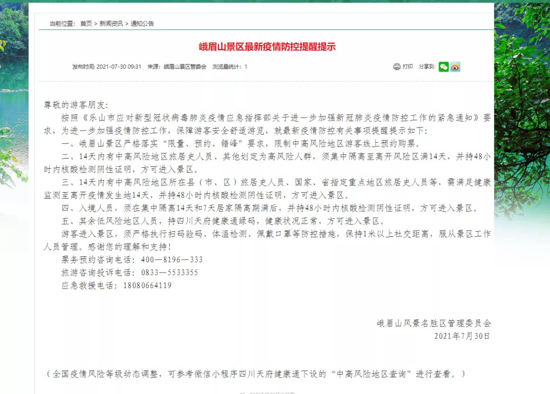 7月30日,峨眉山景区发布最新疫情防控提醒提示称,景区将严格落实“限量、预约、错峰”要求,限制中高风险地区游客线上预约购票。
