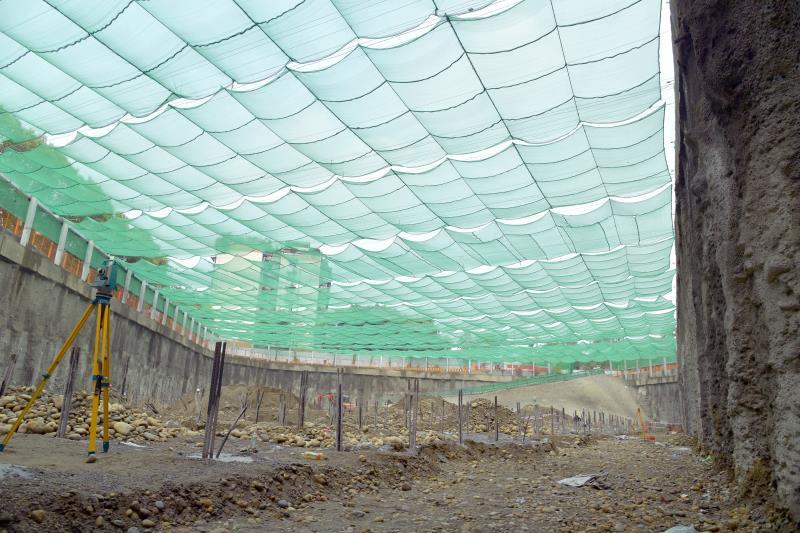 其中,防尘网单元通过传导及控制箱单元实现天幕系统的开启和关闭,通过钢丝绳拉结绷紧的方式覆盖整个基坑施工面,在基坑土方开挖、地基处理以及垫层施工阶段实现全封闭、全覆盖施工。