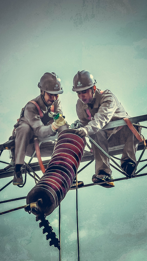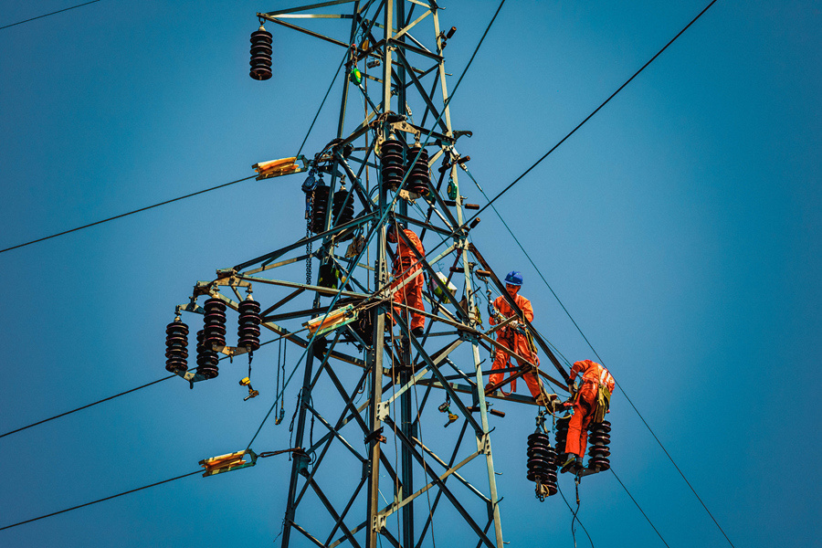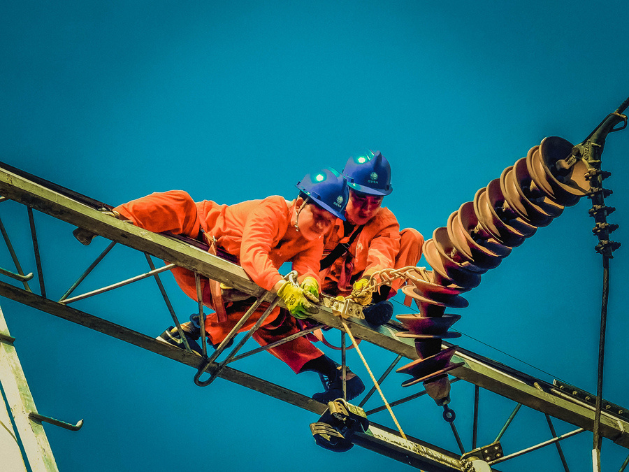 7月29日,在四川省巴中市通江县,国网通江县供电分公司员工在更换110千伏变电站母线绝缘子。