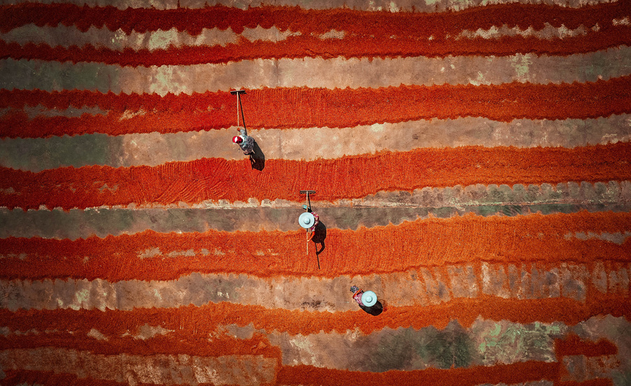 7月27日,宜宾市南溪区长兴镇村民正在院坝晾晒刚采收的高粱。