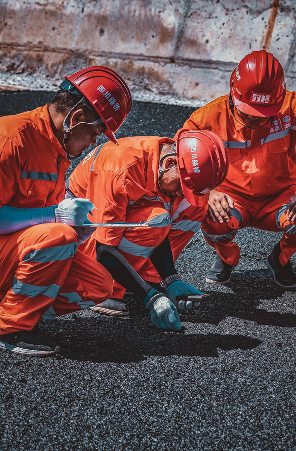 7月29日,在四川省巴中市通江县境内,镇(陕西省镇巴县)广(四川省广安市)高速王坪至通江段A-LM1标段,工人们冒着高温测量油面层温度。