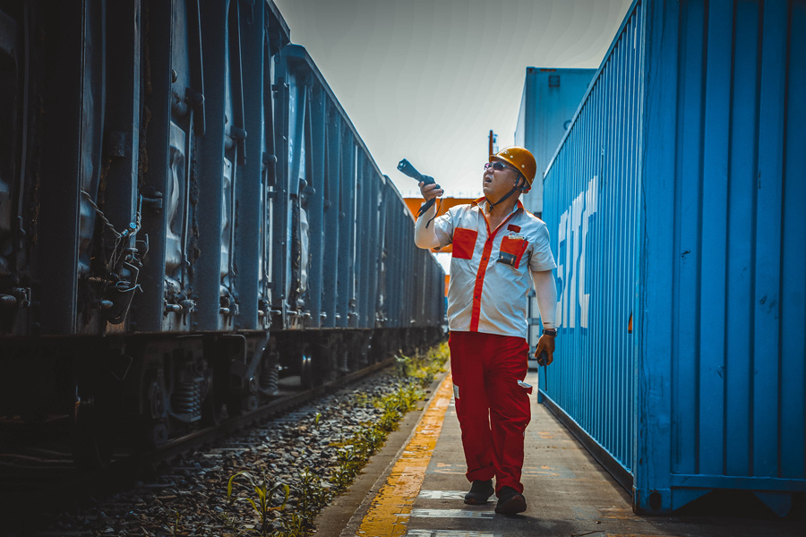 7月28日,成都国际铁路港集装箱中心站,工作人员冒着酷暑检查货箱。