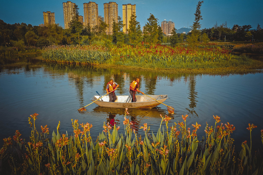 7月29日,在仁寿县城市湿地公园,县住建局的党员志愿者正在打捞水面漂浮物。