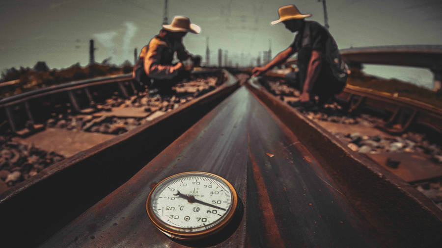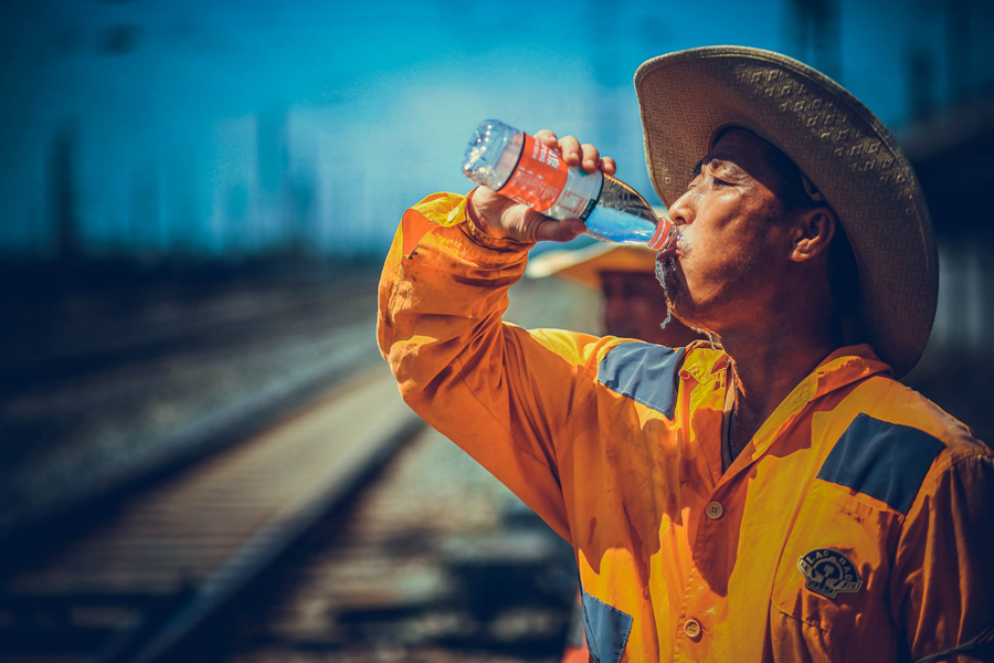 7月30日中午,四川江油火车站,宝成铁路铁轨温度接近60摄氏度,中国铁路成都局集团有限公司绵阳工务段江油线路车间的铁路职工坚守岗位,认真巡查铁道线路。