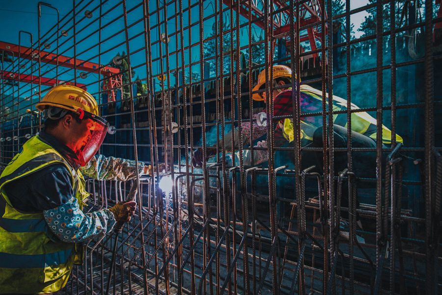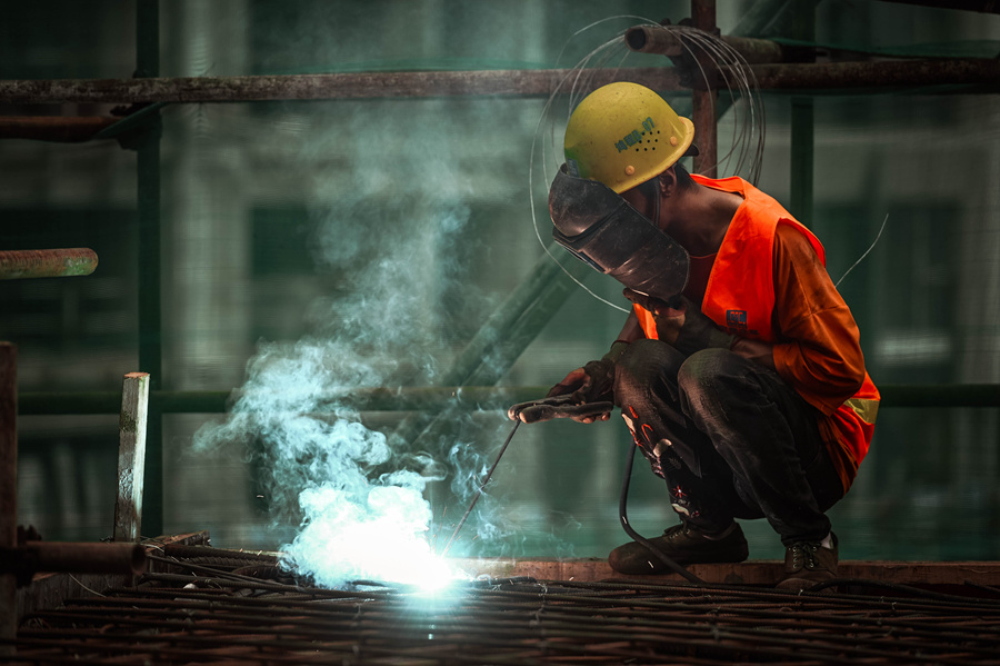 7月27日,成都金融广场项目建设施工现场,建筑工人在焊接建材。