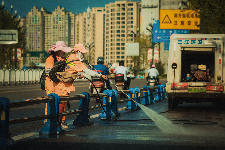 7月23日,在宜宾三江新区长翠路,环卫工人坚守岗位,清洗街道。