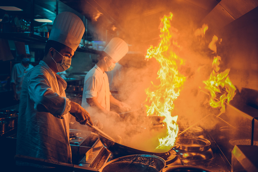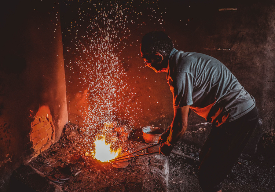 7月29日,在凉山州会理市鹿长镇兴隆村铜火锅手工坊,工匠正在高温烤铜饼。