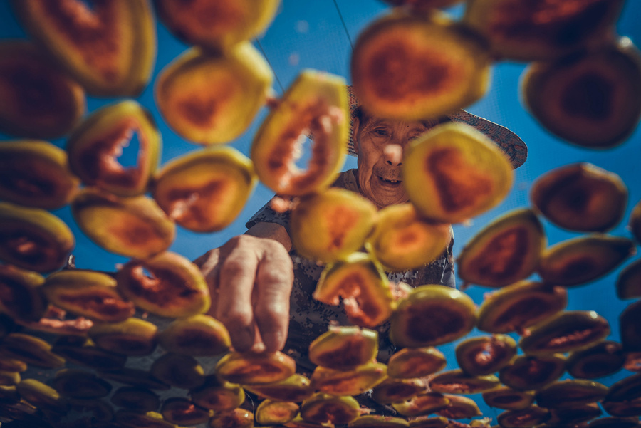 7月29日,内江市椑木镇光明村村民在高温下晾晒无花果片。
