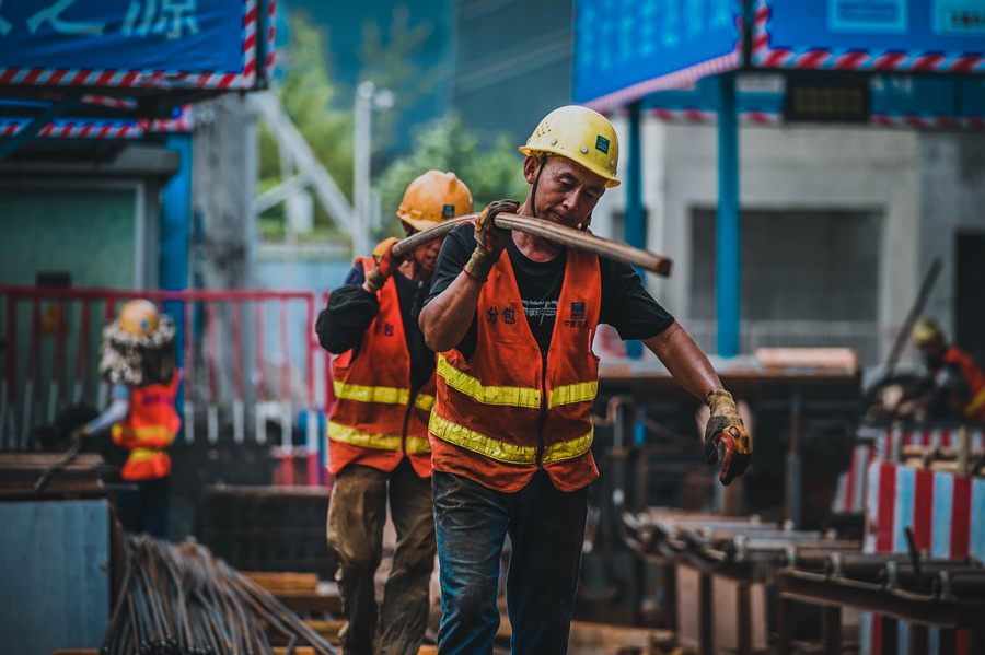 7月27日,成都金融广场项目建设施工现场,建筑工人正在运送建材。