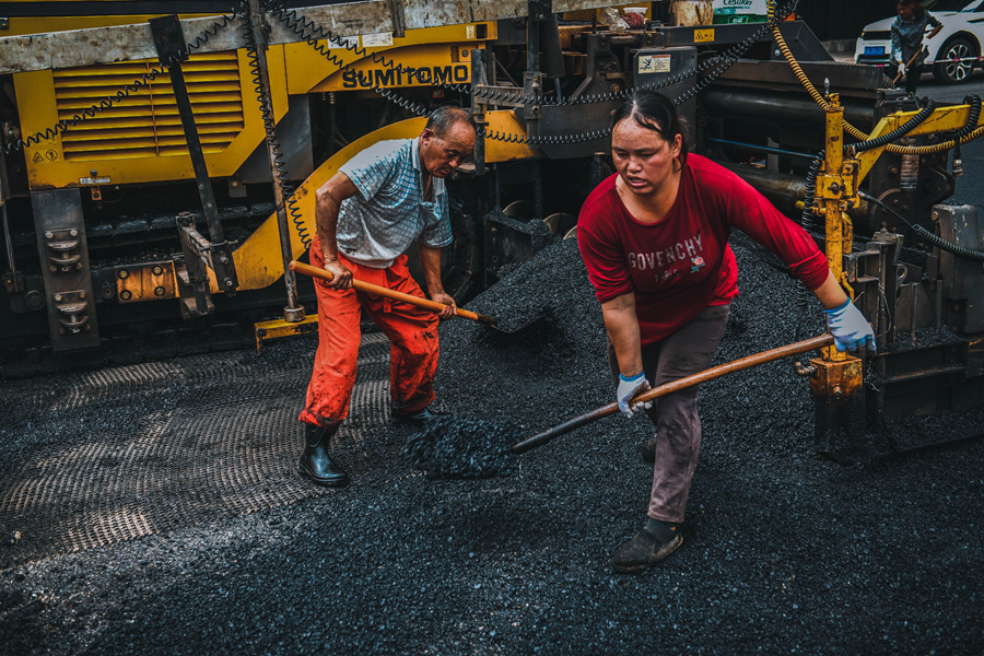 7月29日,工人在巴中市通江县壁州街道环城南路铺油施工作业,确保道路如期畅通。