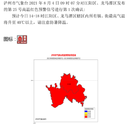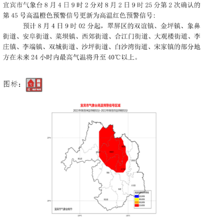 富顺县、东兴区、隆昌市、威远县、泸县、华蓥市、合江县、南溪区、叙州区、纳溪区、兴文县、筠连县、叙永县、古蔺县、长宁县、江安县、沐川县、五通桥区、井研县、峨边县、马边县、夹江县、峨眉山市等地方气象台发布高温红色预警信号。