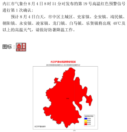 自贡、内江、宜宾、泸州、乐山5市气象台发布高温红色预警信号: