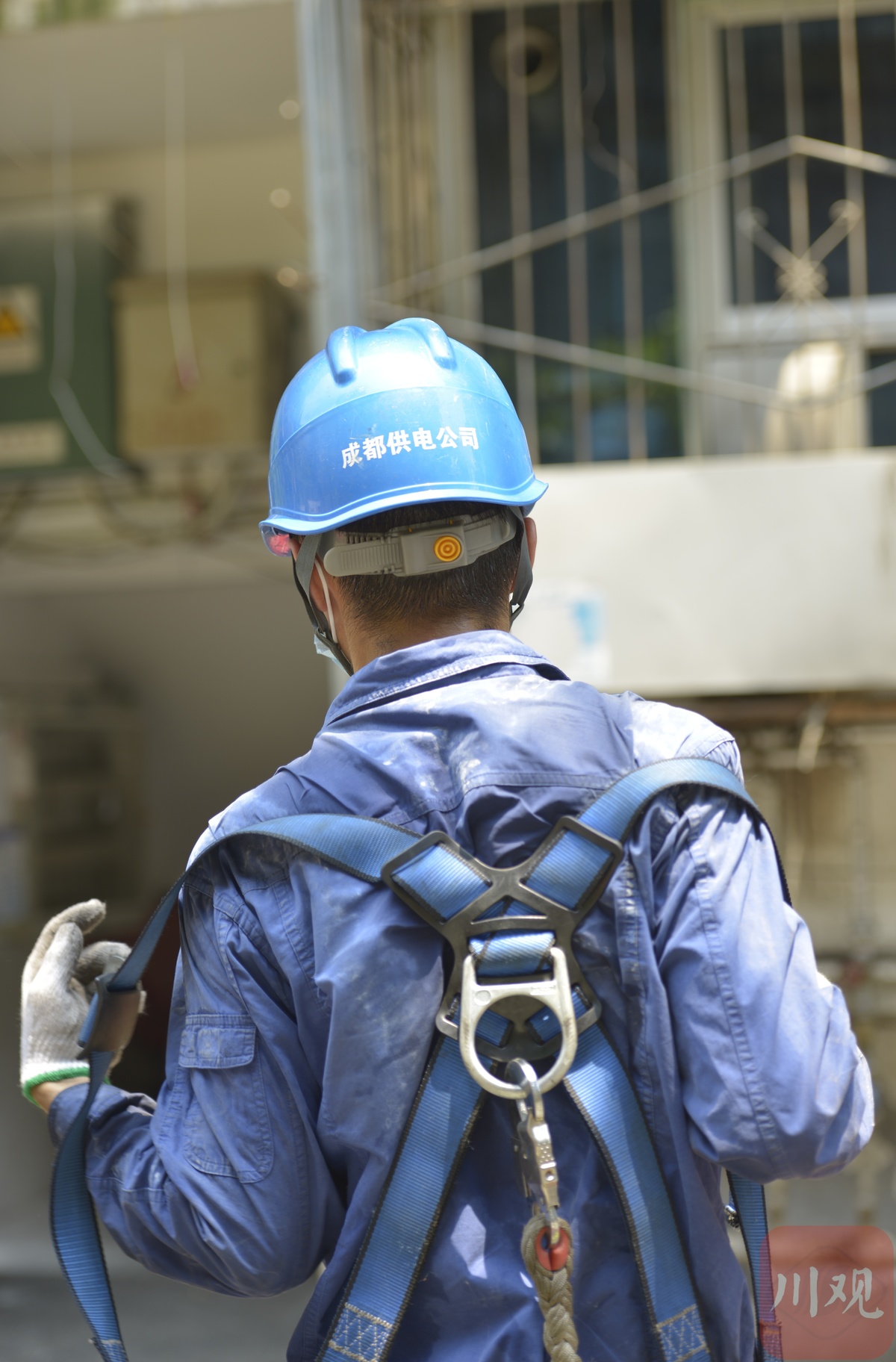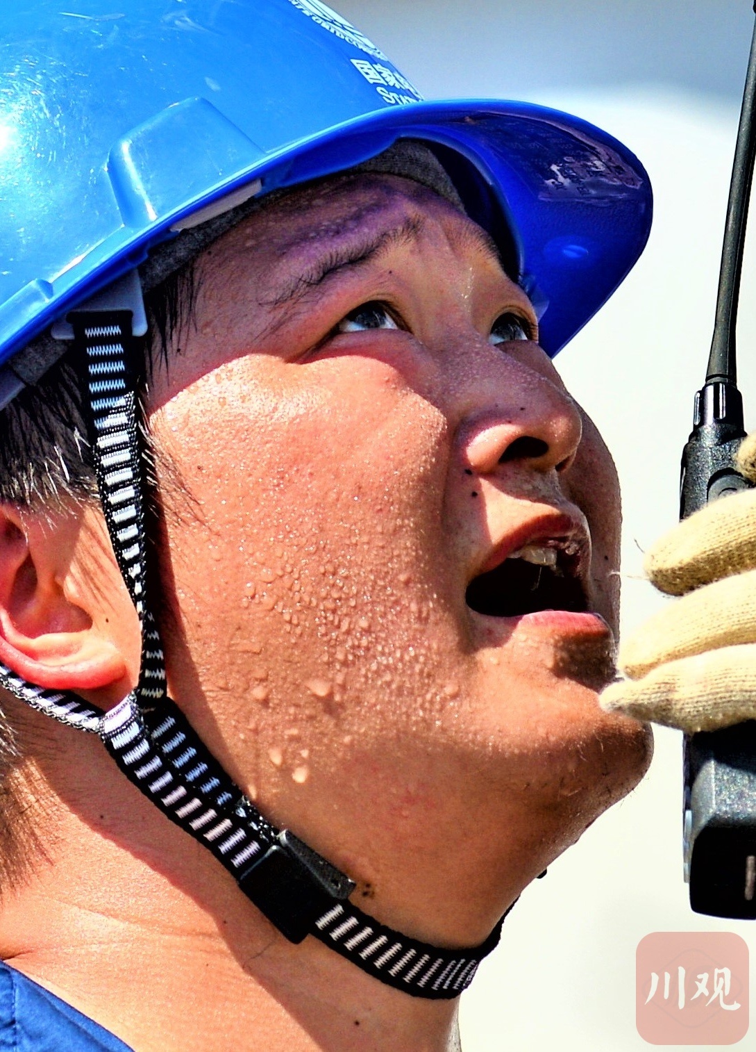 简阳供电公司运维抢修班李炼钟在35千伏云龙变电站增容现场进行安全管控,满脸挂满了汗珠。
