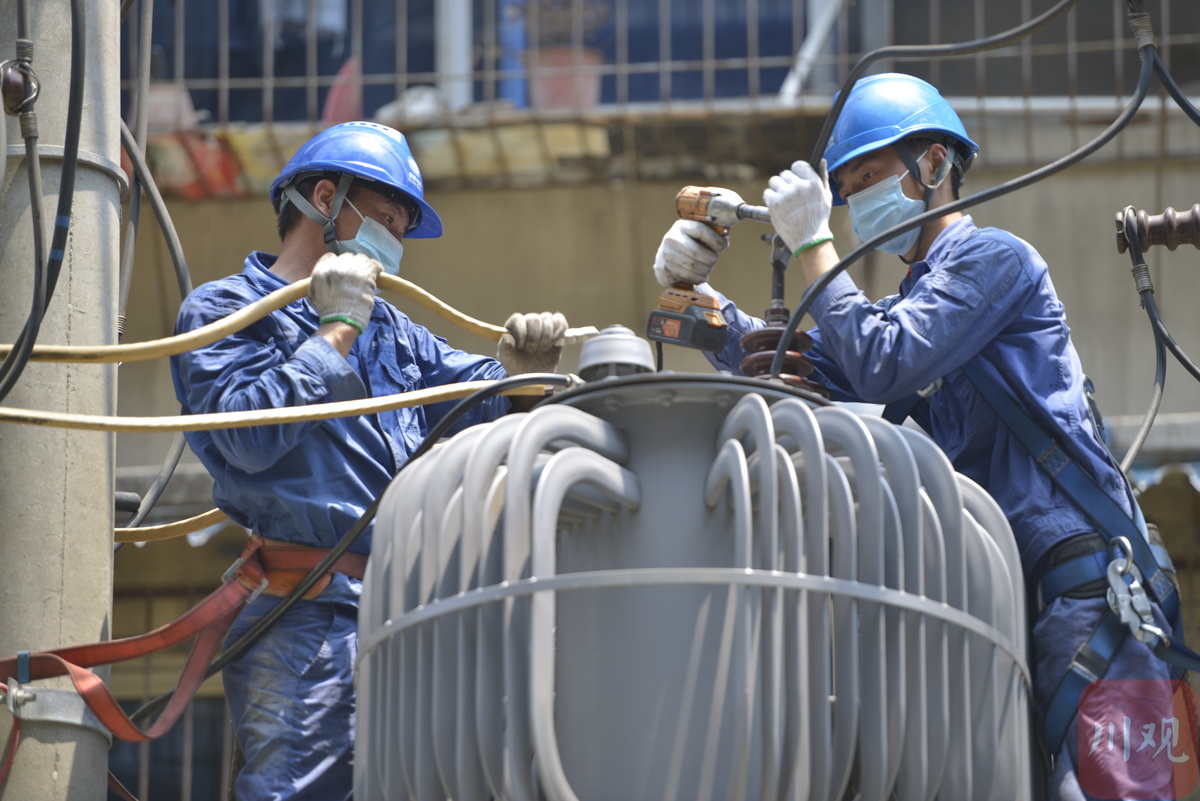 8月3日正午,在成都市武侯区红牌楼北街23号汇民苑,国网成都供电公司抢修人员挥汗如雨,冒着40度高温对超负荷运行的老旧变压器器进行抢修更换,衣服被汗水浸透。