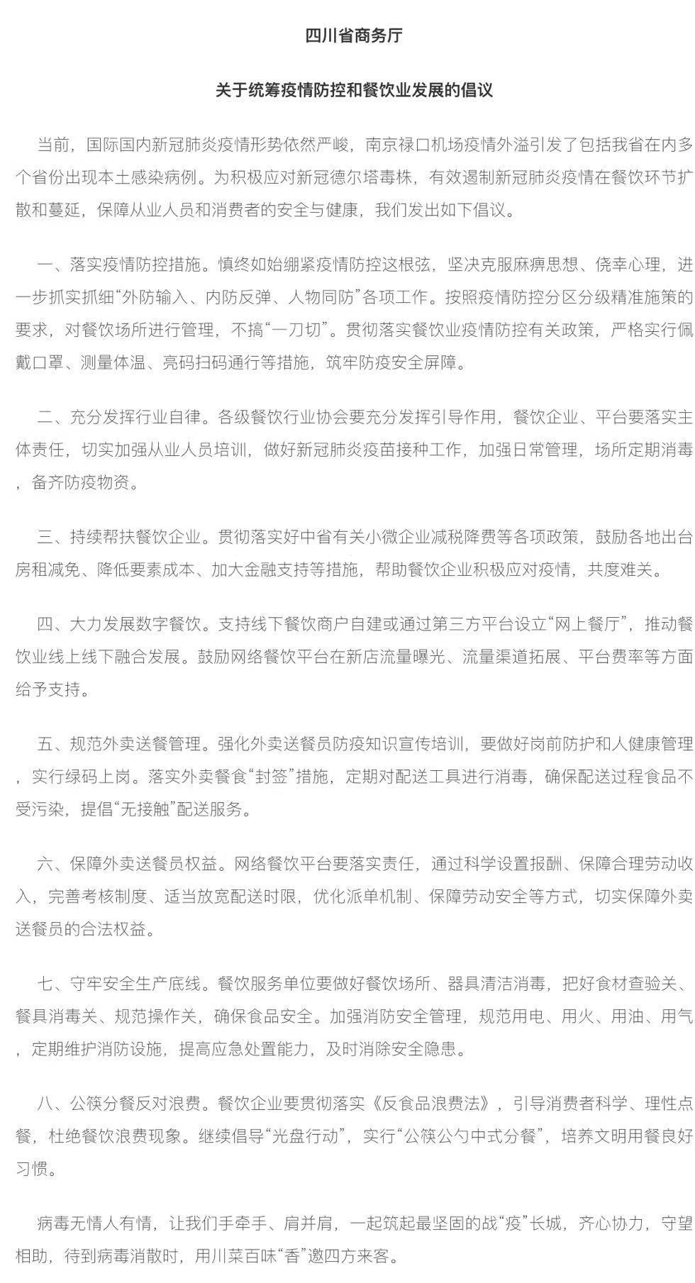 8月5日,省商务厅发出《关于统筹疫情防控和餐饮业发展的倡议》。倡议提出,按照疫情防控分区分级精准施策的要求,对餐饮场所进行管理,不搞“一刀切”;鼓励各地出台房租减免、降低要素成本、加大金融支持等措施,帮助餐饮企业积极应对疫情,共度难关等。倡议发出第一时间,得到了70家包括省市餐饮协会、第三方平台等在内以及上万家餐饮企业的积极响应。