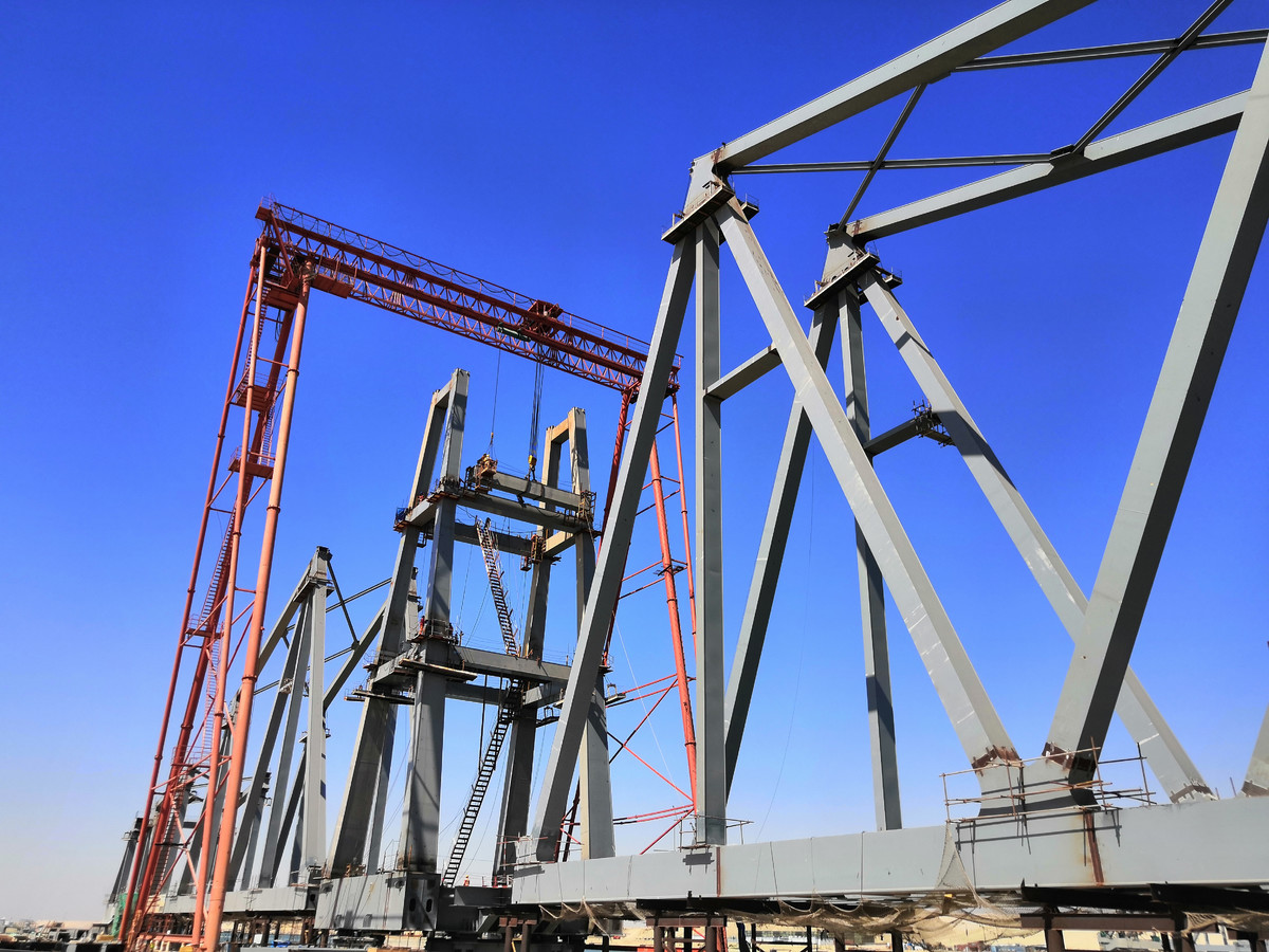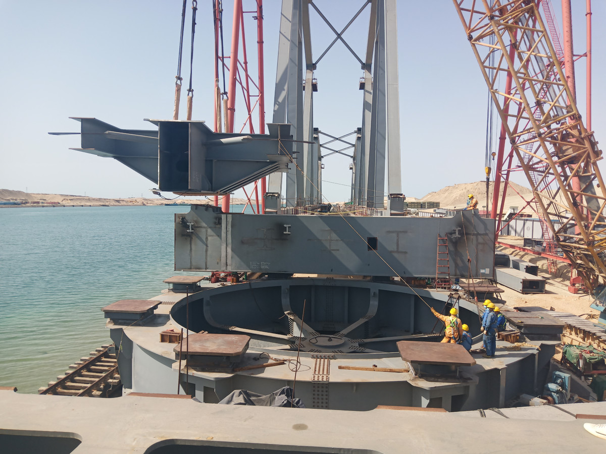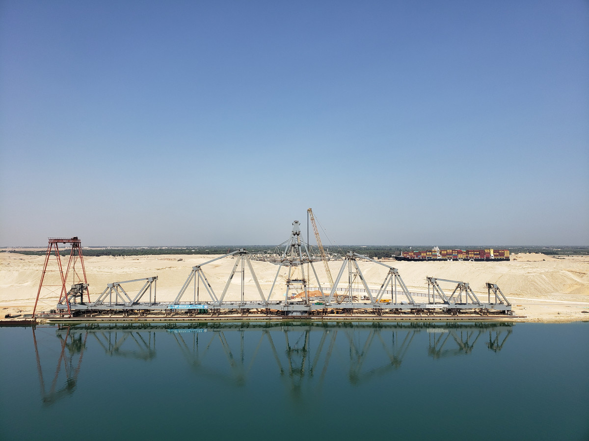 埃及苏伊士运河铁路桥新桥位于埃及伊斯梅利亚省,跨越著名的苏伊士运河,两端分别连接亚非大陆,对共建“一带一路”和埃及苏伊士运河经济区建设具有重要意义。项目采用EPC总承包模式建设,主要工程为在新苏伊士运河上新建主跨340米双翼平转开启桥梁和对旧运河已有桥梁的改造升级。新桥建成后将成为世界跨径最大和承载最大的双线铁路平转开启桥梁。