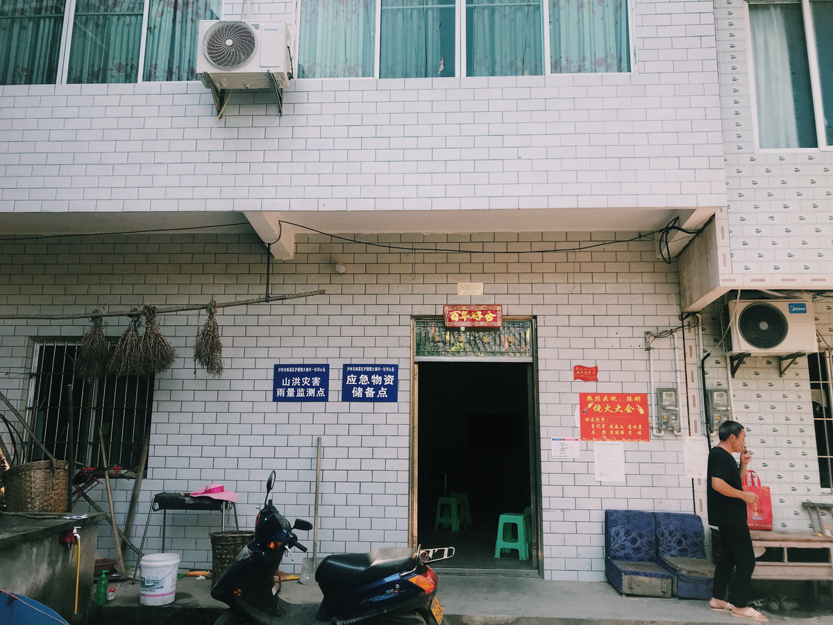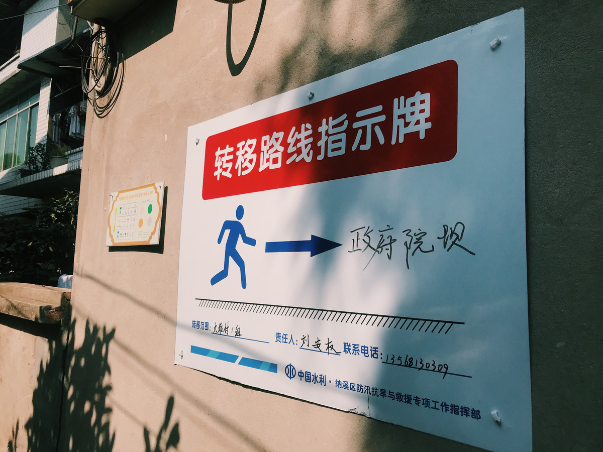 陈刚屋子的外墙上,还贴着“逃生至高点”“山洪灾害雨量监测点”“应急物资储备点”三张蓝底白字的标识。穿梭在大雄村河心岛的房屋小路间,也能见到多个转移路线指示牌。