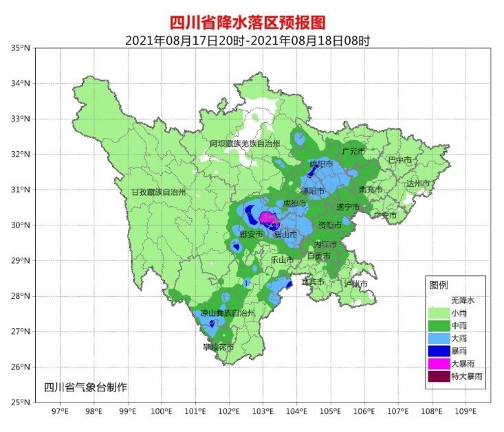 四川省气象台预计,今天晚上,盆地各市阴天间多云有阵雨或雷雨,雨量可达中雨,其中绵阳、德阳、成都、雅安、眉山、乐山6市的部分地方有大雨,局部暴雨或大暴雨;川西高原和攀西地区阴天间多云有阵雨或雷雨,其中川西高原东部和攀西地区北部有中到大雨,局部暴雨。