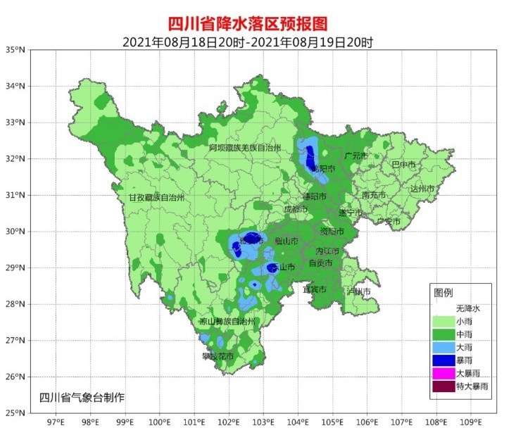 18日晚上到19日白天,盆地各市阴天间多云有阵雨或雷雨,雨量小到中雨,其中绵阳、雅安、乐山3市局部地方有大雨到暴雨;川西高原和攀西地区阴天间多云有阵雨或雷雨,其中川西高原北部和攀西地区部分地方有中雨,局部大雨。