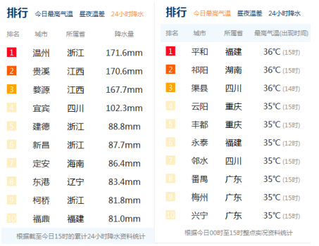 截至8月17日16时,四川宜宾拿下全国城市24小时累计降水量第4名,而四川渠县则登上了全国城市24小时最高气温排行榜榜首。