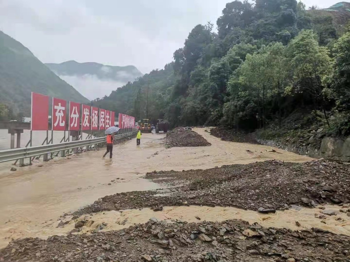 平武辖区国道247线1083KM平武平通太平坝、梅林路段出现泥石流,道路中断,正在抢通,平通派出所在林家坝超限站对绵阳方向的上行车进行交通管制。