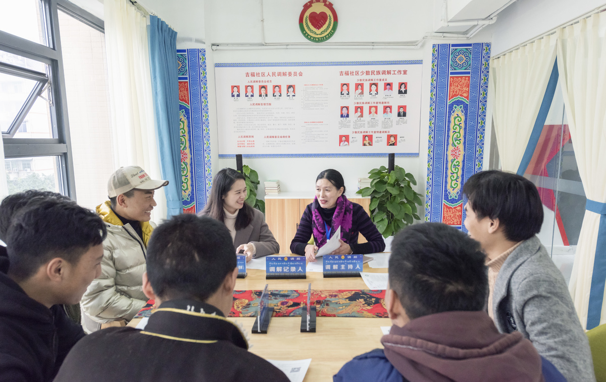 这样的事情在晋阳街道不是个案,晋阳街道下辖5个社区和3个村,辖区常住或流动少数民族居民2500余人,有藏、羌、回和土家族等11个民族。吉福社区党委书记李含荣介绍说:“我们这边少数民族聚居数量比较多,针对老百姓之间产生的矛盾,晋阳街道吉福社区法律之家,在用好工作人员的基础上,发动社区里面有法律背景、有威望的热心群众一起建了个少数民族调解工作室,工作室成立5年了,调解了219个案件,成功率达到了95%。”