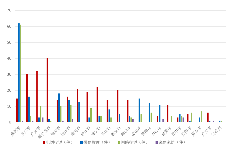 川观新闻记者梳理发现,电话举报是群众反映问题的主要途径。7月,群众通过电话、微信、网络、来信来访渠道反映污染问题分别占举报总量的43.9%、29.5%、21.9%、4.7%。从区域受理举报量看,攀枝花电话举报量第一,占全省同类型举报量的14.0%;成都微信、网络举报量均为第一,分别占全省同类型举报量的30.8%、40.9%;广元、巴中来信来访举报量均占全省同类型举报量的18.8%。