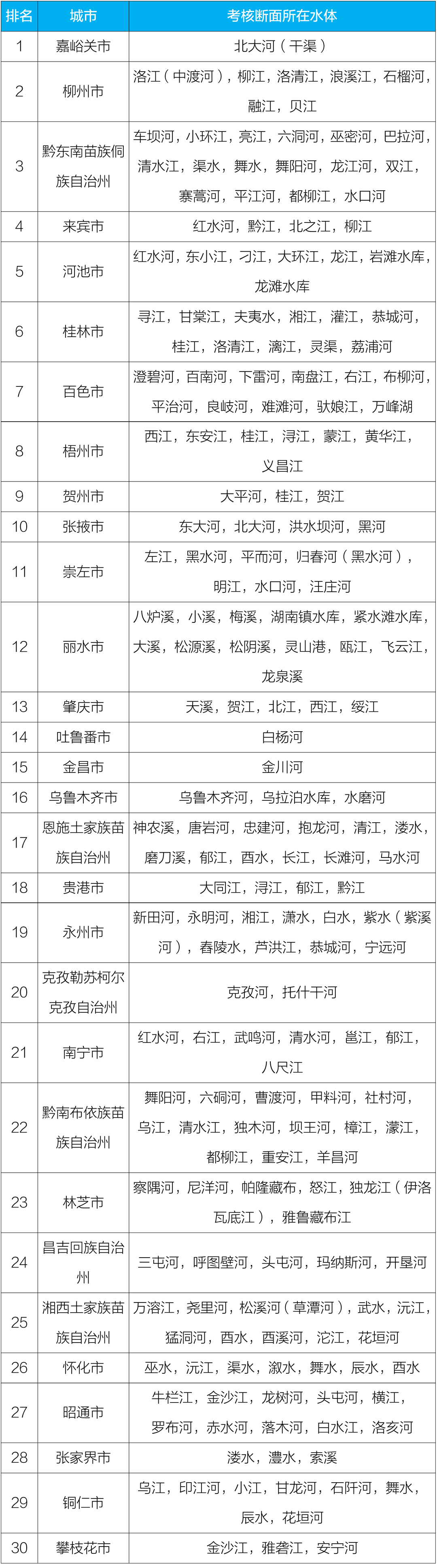 从2019年5月起,除了“大气排名”,生态环境部开始发布一个新的“水质排名”,即对全国地级及以上城市的地表水考核断面的水环境质量以及变化情况进行排名,此项排名共涉及333个城市。