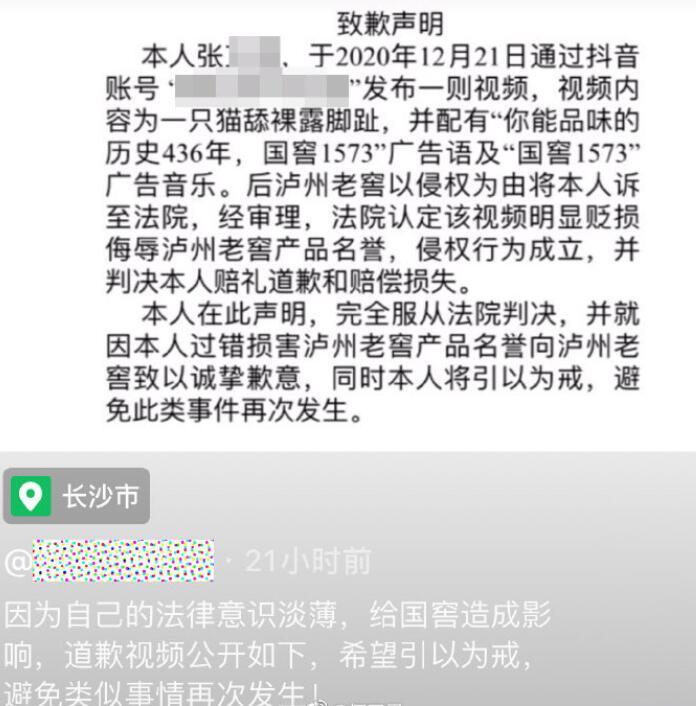 近日,女子因配乐被判赔泸州老窖7万元一事在网络上引起广泛关注。8月17日,24岁的张女士在自己的短视频账号上发布了一条向泸州老窖道歉的声明。据张女士介绍,她去年以搞笑为目的拍了一段宠物猫闻自己脚的视频,配乐是国窖1573的广告音乐。她因此被泸州老窖以名誉权侵权起诉到泸州市龙马潭区人民法院。