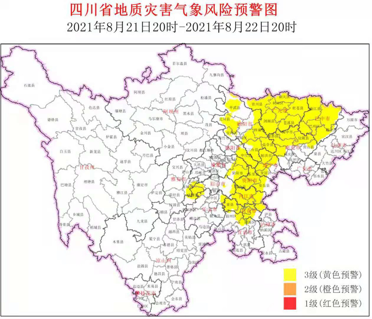 8月21日,四川省地质灾害指挥部办公室根据四川省地质环境条件,结合四川省气象台天气预报情况,发布地质灾害气象风险预警:受强降雨影响,8月21日20时至8月22日20时,全省预警范围再度扩大,14市69个县(市、区)拉响“黄色警报“。