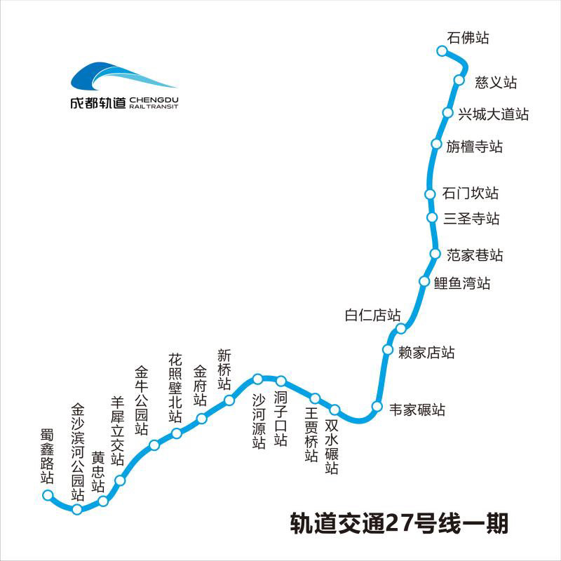成都轨道交通27号线一期工程北起新都区石佛站,西至青羊区蜀鑫路站,自北向西沿香城大道-万石路-凤凰大道-中环路-金府路-蜀明路-同怡路-金泽路-蜀江路敷设。沿线途经新都区、金牛区、成华区、青羊区。线路全长24.86千米,全线共设车站23座,其中高架线约7.51千米,设站6座;地下线17.35千米,设站17座。可分别与既有2号线、6号线、5号线、1号线接驳换乘。该线路建成通车后将加强成都北部区域与中心城区交通联系,扩大轨道交通辐射范围,改善沿线居民公共交通出行条件。