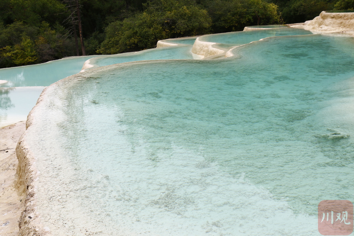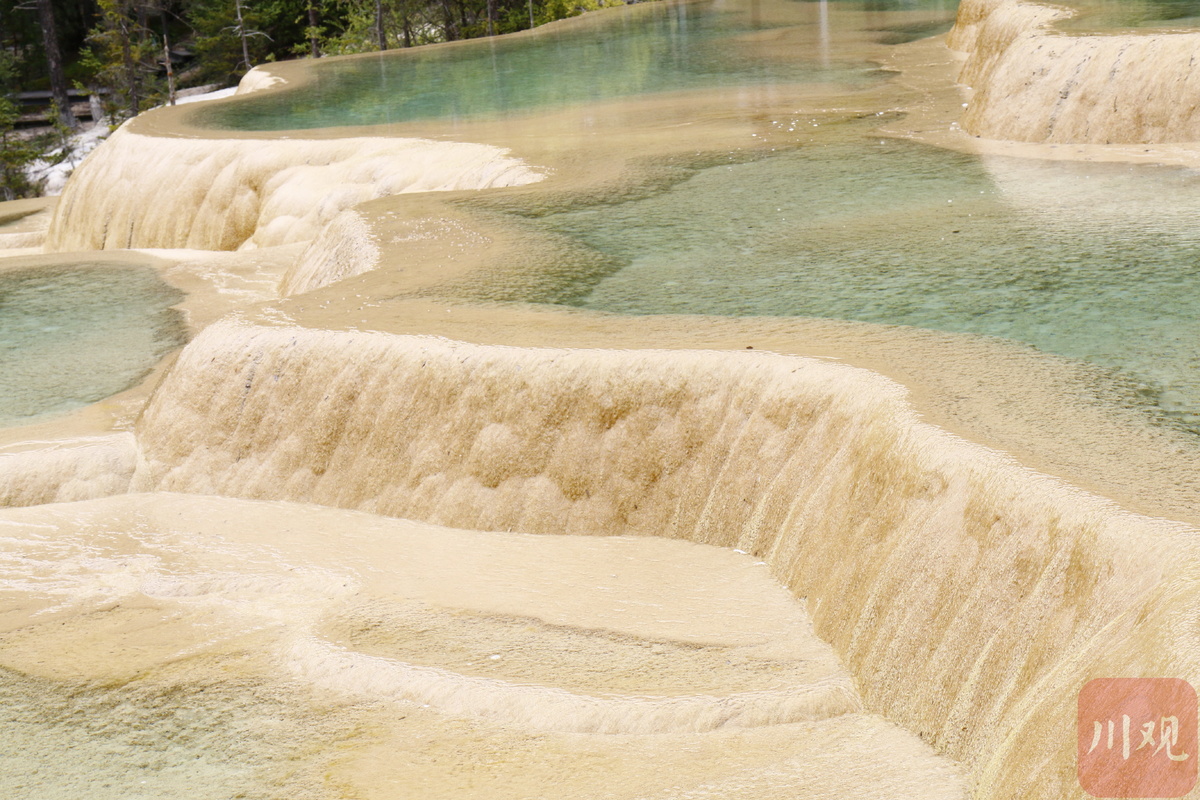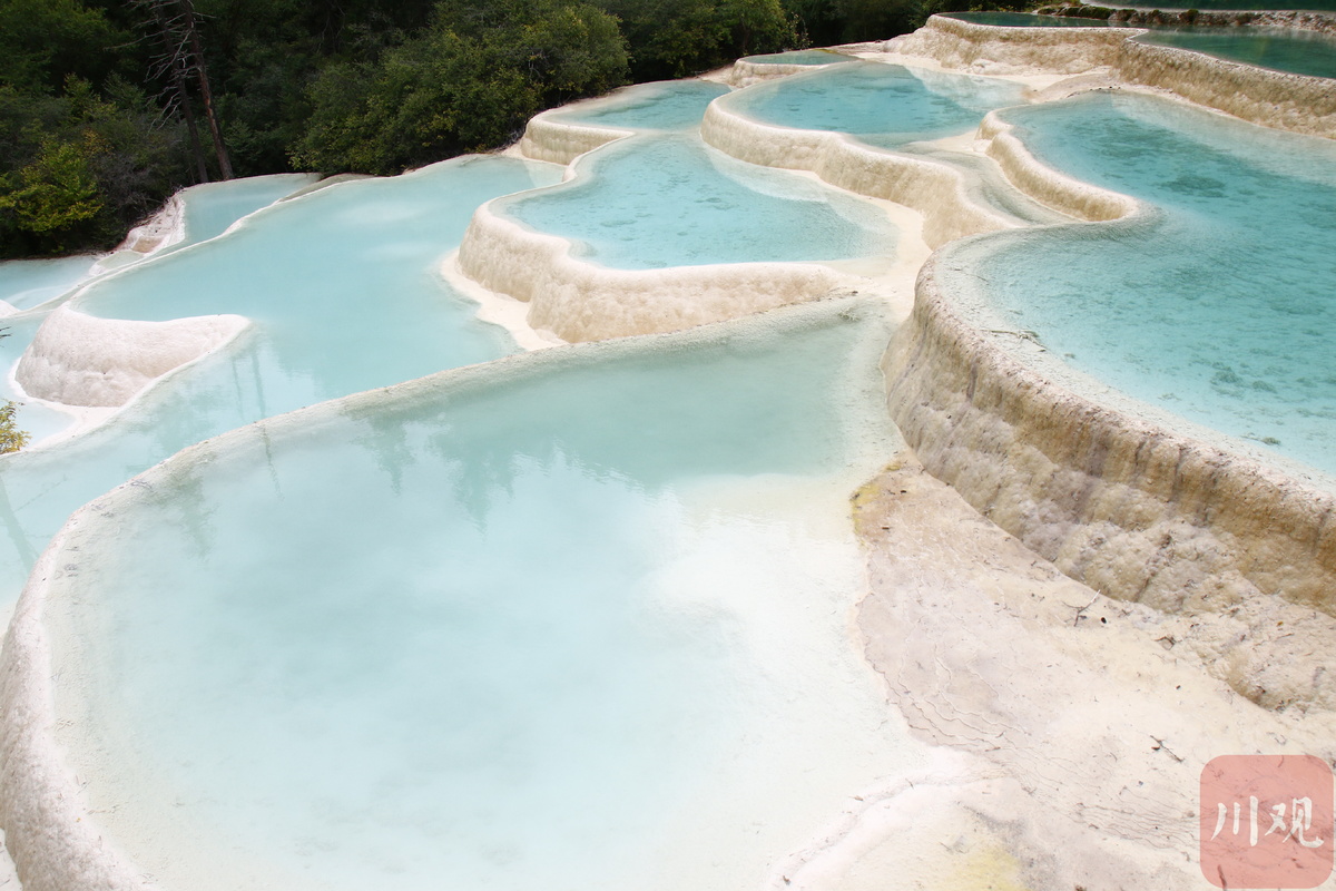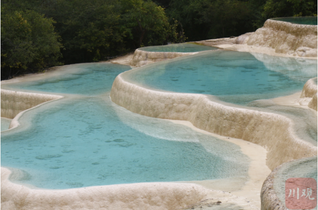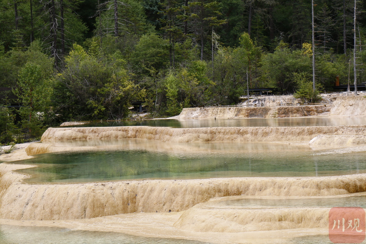 神仙池的地貌侵蚀切割得特别剧烈,溪间的落差大,山地形成了2600个大小不等、水色明丽的水潭和高山湖泊,也就是当地人说的“海子”和“钙华台地”。它是典型的地表喀斯特地貌,成片的山坡被黄色、乳白色钙质包裹,形成一个个奇特的盆筑状钙华池和钙华坡。