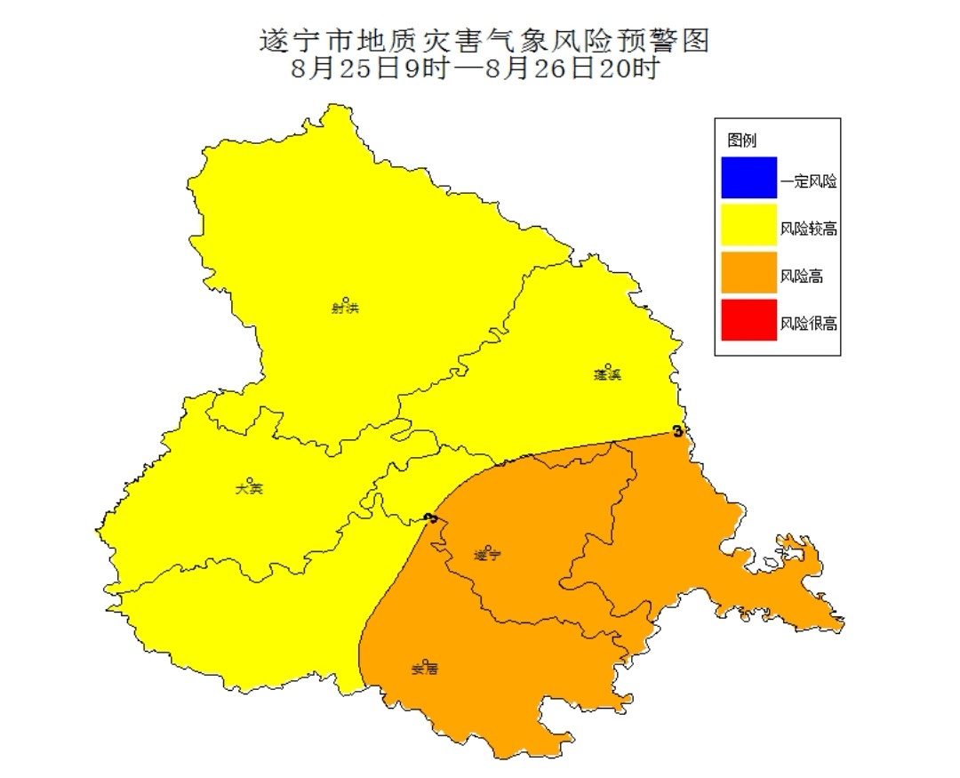 8月25日9时30分,遂宁市自然资源和规划局与遂宁市气象局联合发布地质灾害气象风险预警:
