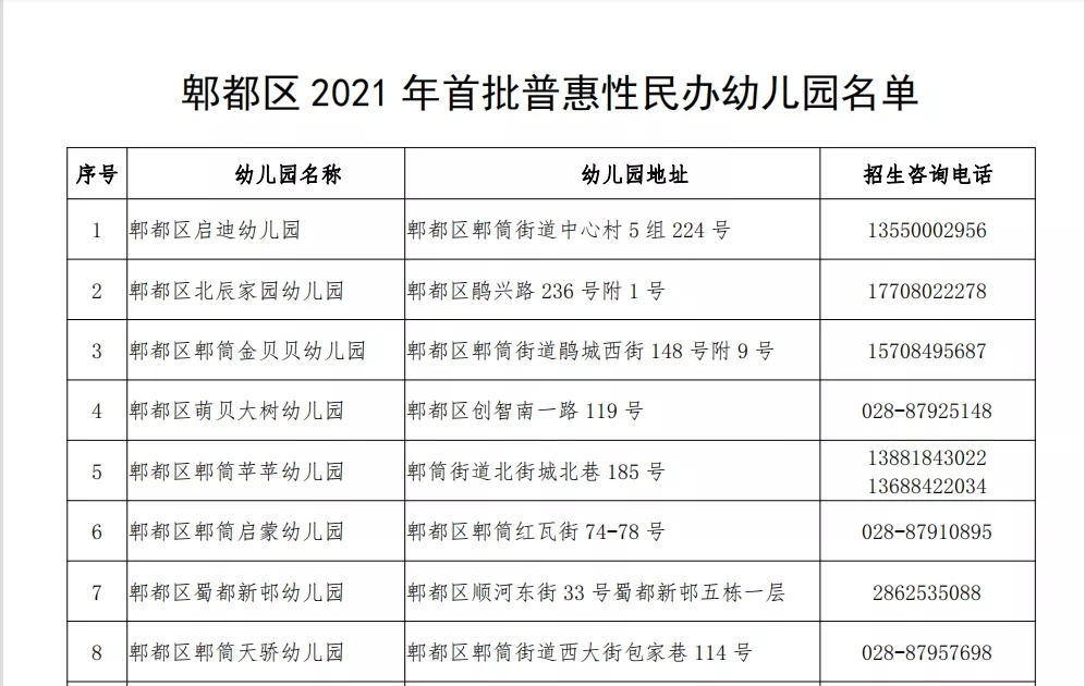 在经资料审核、实地考察和综合评审,拟确定郫都区启迪幼儿园等88所为郫都区2021年首批普惠性民办幼儿园,现将名单公示如下(排名不分先后):