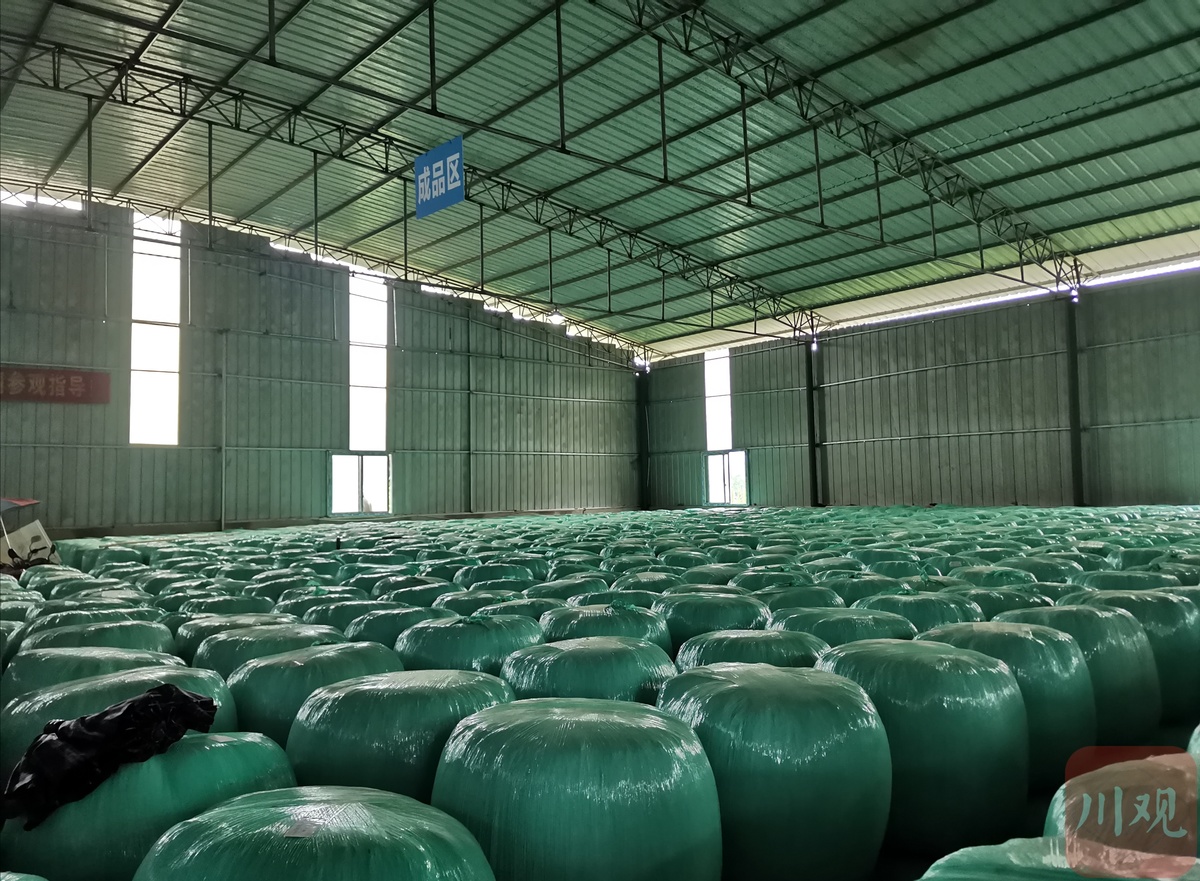 8月25日,大竹县欧家镇新四村的牧草地里,成片的杂交狼尾草已高过人头,静待收割。不远处的饲草加工车间内,一台饲草青储打包机正将收割后的饲草裹包青贮。