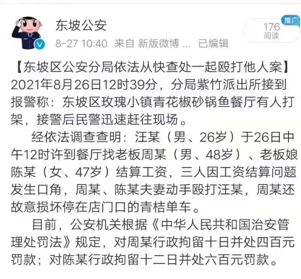 8月26日,一则“女老板殴打暑期工学生,民警到场后就走了”的信息在眉山本地网络热传,引发了社会的关注。在接到群众报警后,眉山市公安局东坡区分局立即出警,将打人双方带回调查,最后对打人老板及其丈夫处以了行政拘留和罚款的处罚。