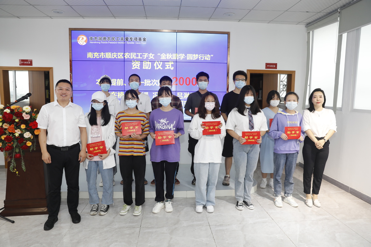 9月2日,川观新闻记者从南充市人社局解到,近日南充顺庆农民工子女“金秋助学·圆梦行动”资助仪式在南充市顺庆区人社局举行,34名来自困难农民工家庭的大学新生,领到由南充润德农民工关爱专项基金发放的助学金共计5.5万元。