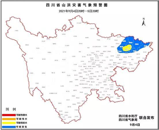 2021年9月4日20时至5日20 时,巴州、恩阳、南江、阆中、仪陇、苍溪等县(市、区)发生山洪灾害可能性较大(黄色);旺苍、通江、平昌、万源等县(市、区)可能发生山洪灾害(蓝色)。