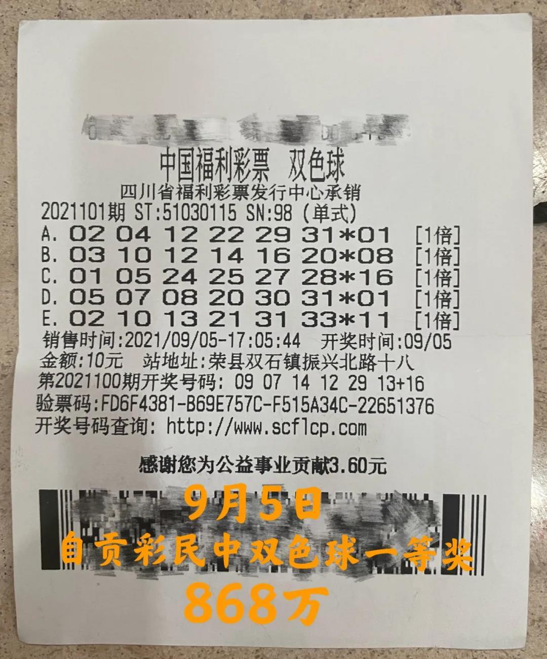 9月5日晚,双色球第2021101期开奖,开出号码:02 04 12 22 29 31+01,全国开出6注一等奖,四川收获1注,单注奖金金额为868万余元。