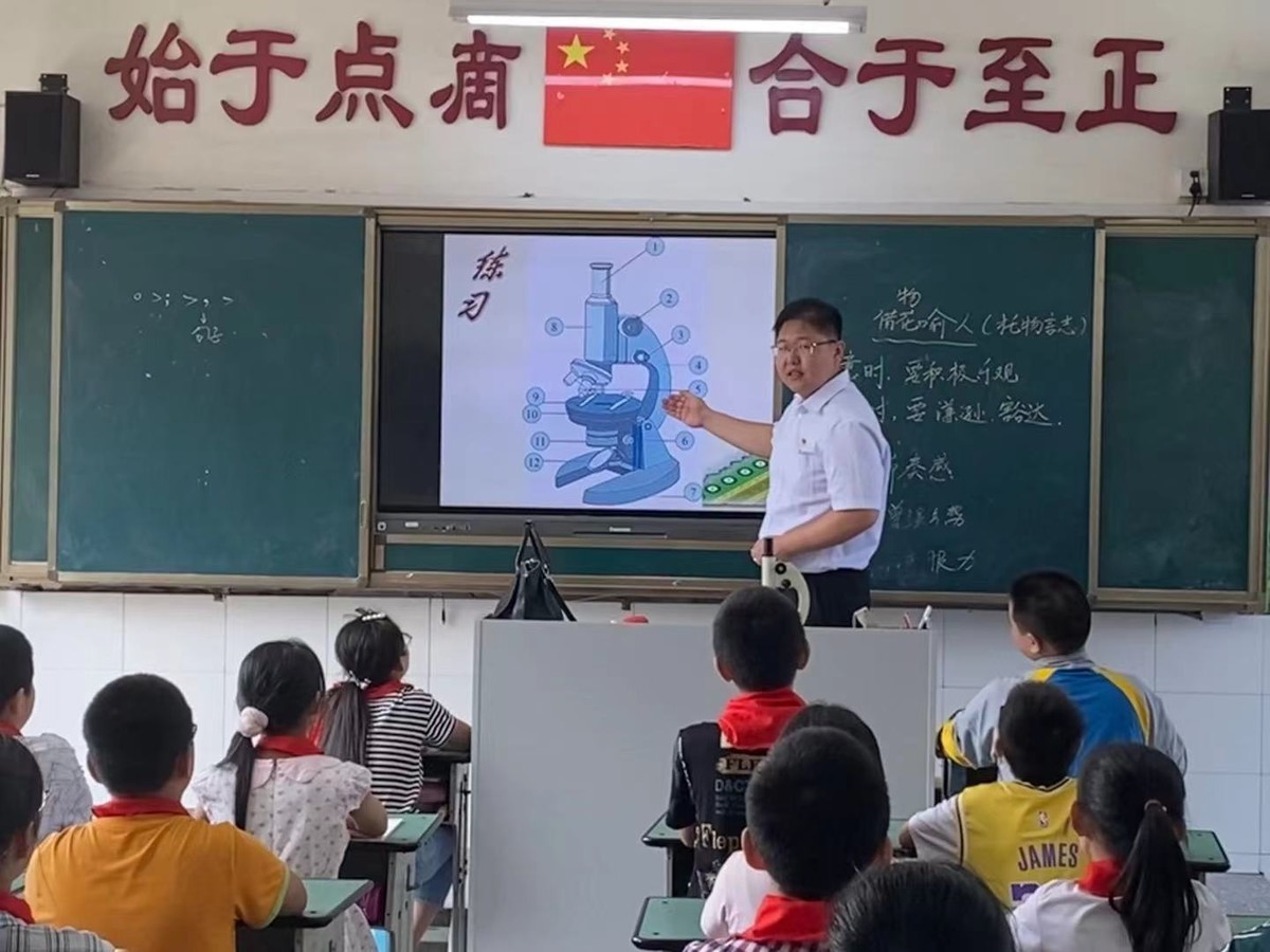 “显微镜该怎么拿呢?”“显微镜应该右手拿镜杆,左手托镜座。”当天上午11点20分,东方小学6年级9班的课堂上,科学老师蒋敏正在讲授如何使用显微镜,同学们争相抢答,课堂氛围活跃。