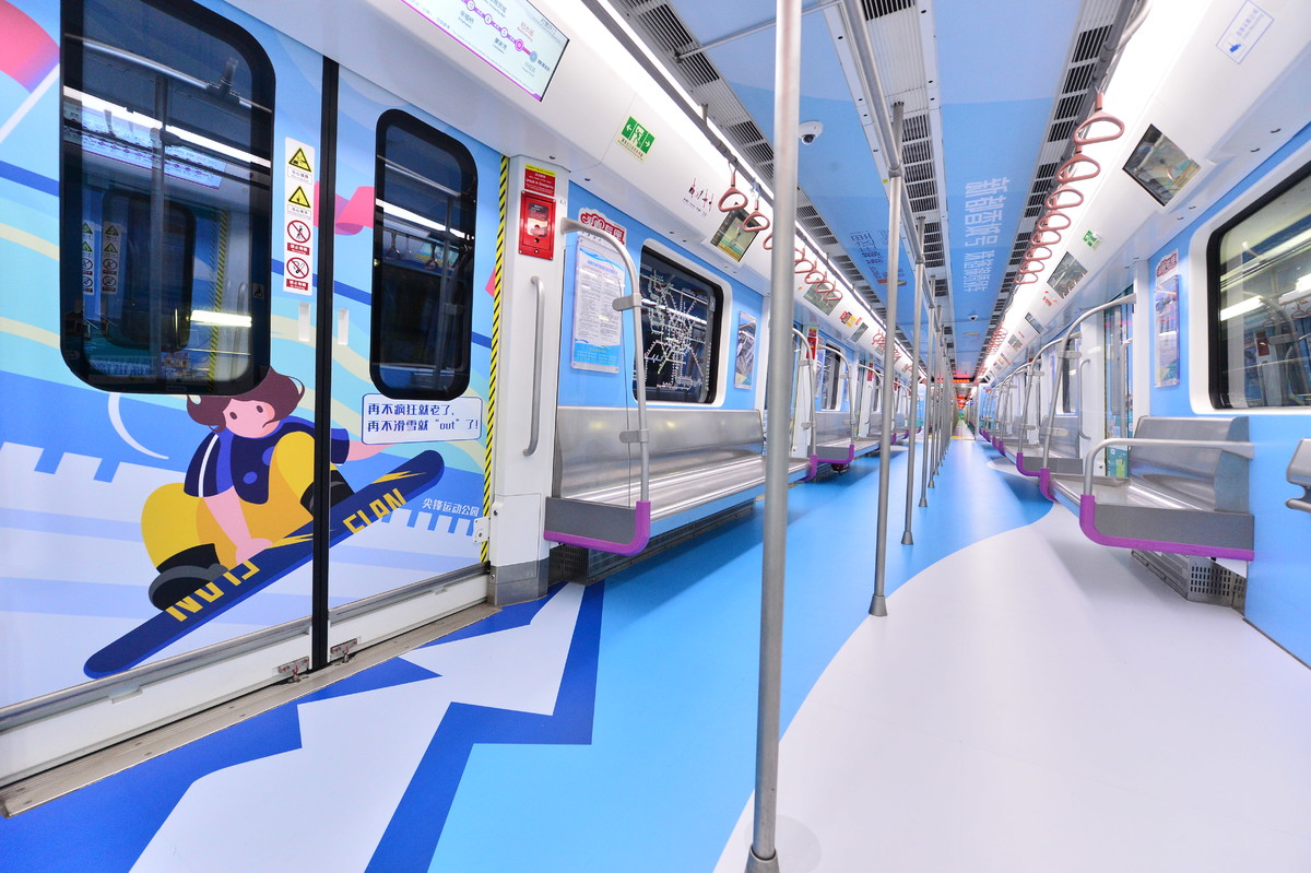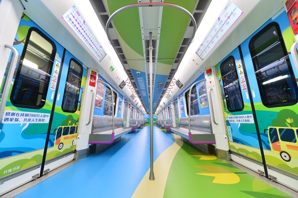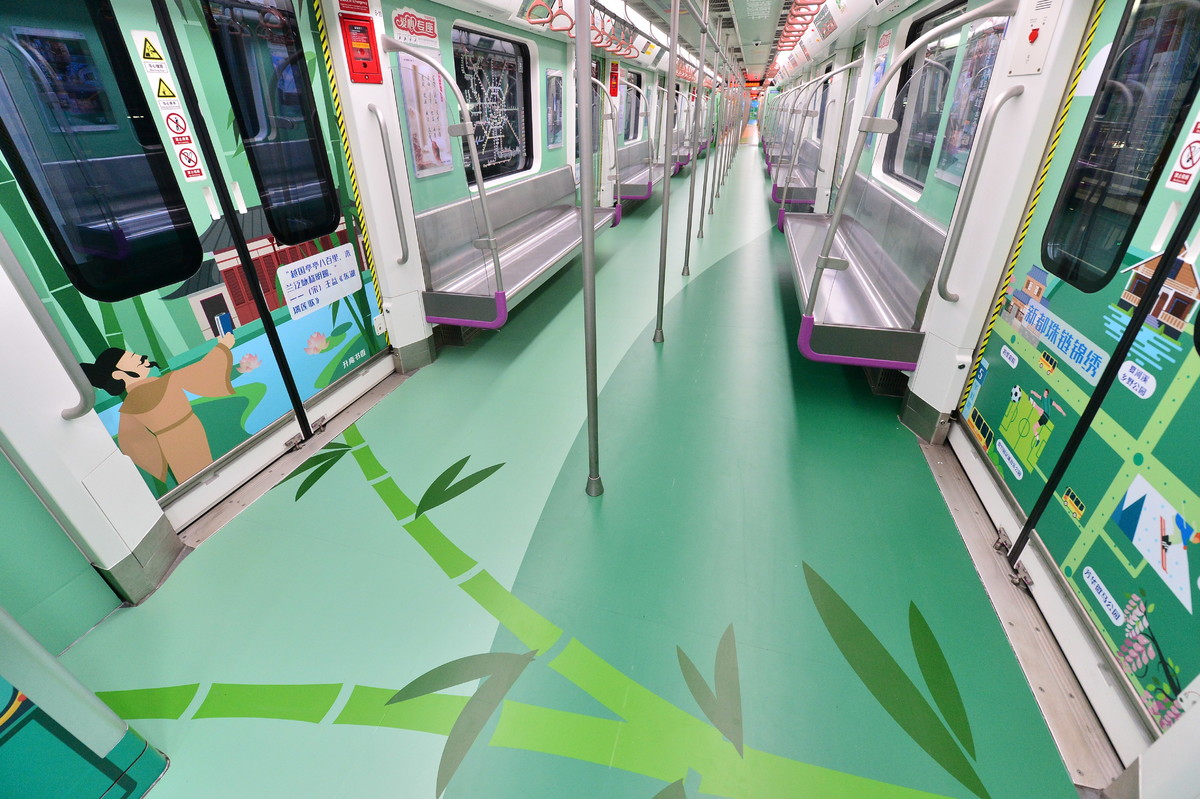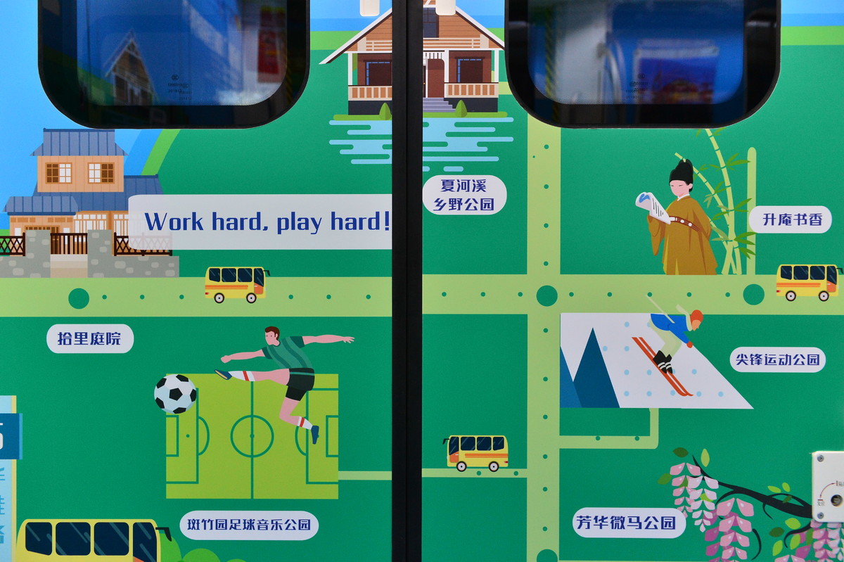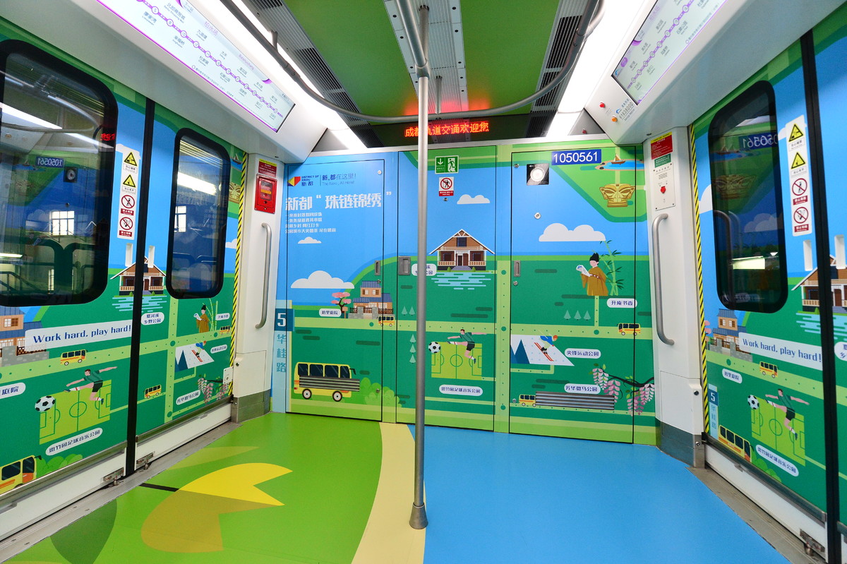“香城号”以年轻人喜闻乐见的“手绘+实景”风格为主,采用扁平化的时尚设计、清新雅致的色彩,让乘客走进主题列车就能感受到新都区“珠链锦绣”的特色。“听着音乐去滑雪,喝杯咖啡踢足球”“放空,就是一种放松”“日常‘城会玩’×周末‘村会耍’=成都休闲生活”……车厢内随处可见的“接地气”趣味话语,引人注目。